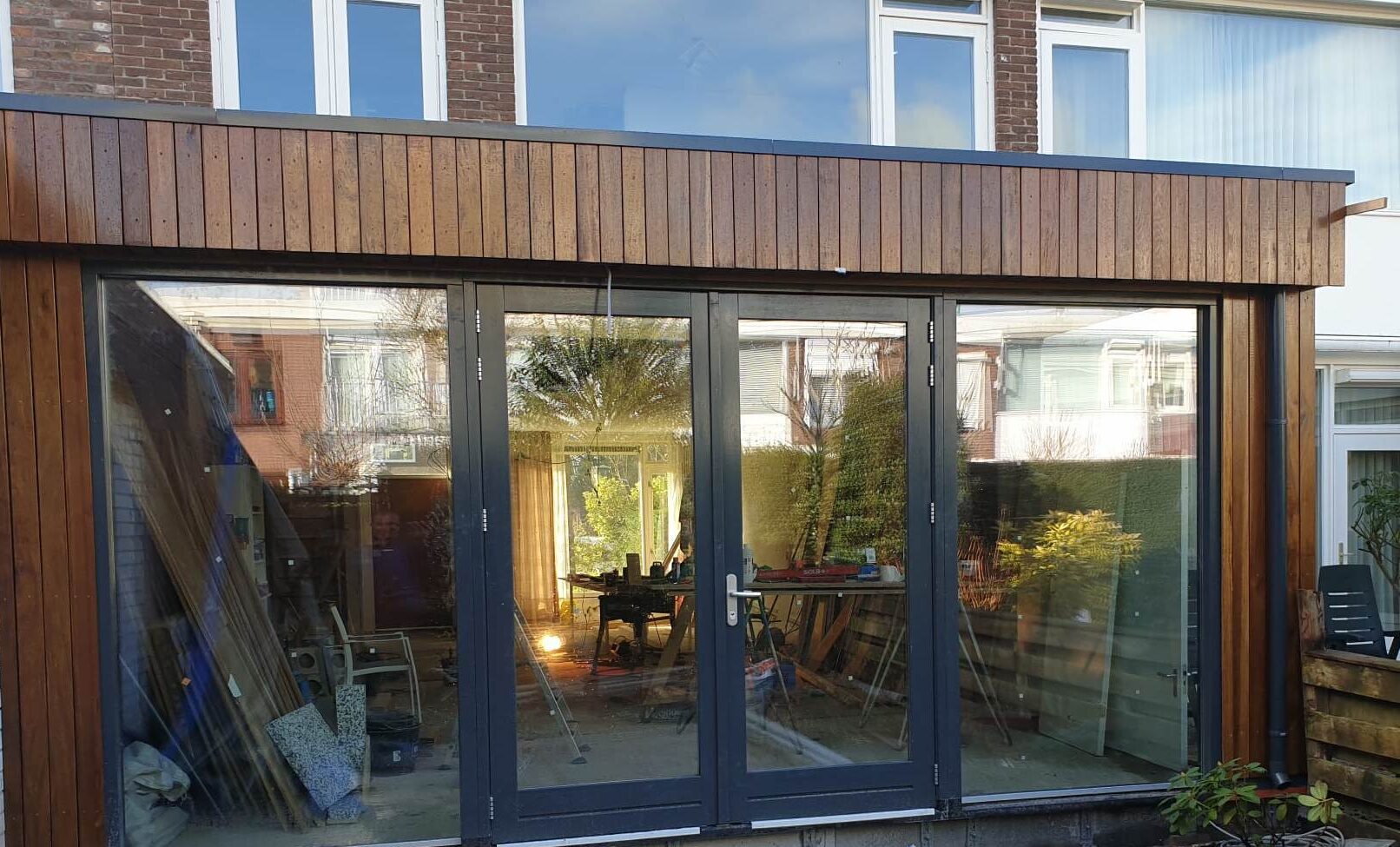 In dat geval zorgen wij voor de fundering en plaatsen de muren daarop. Tevens worden de kozijnen geplaatst en het dak, welke wordt voorzien van dakbedekking en een aansluiting op de gevel.